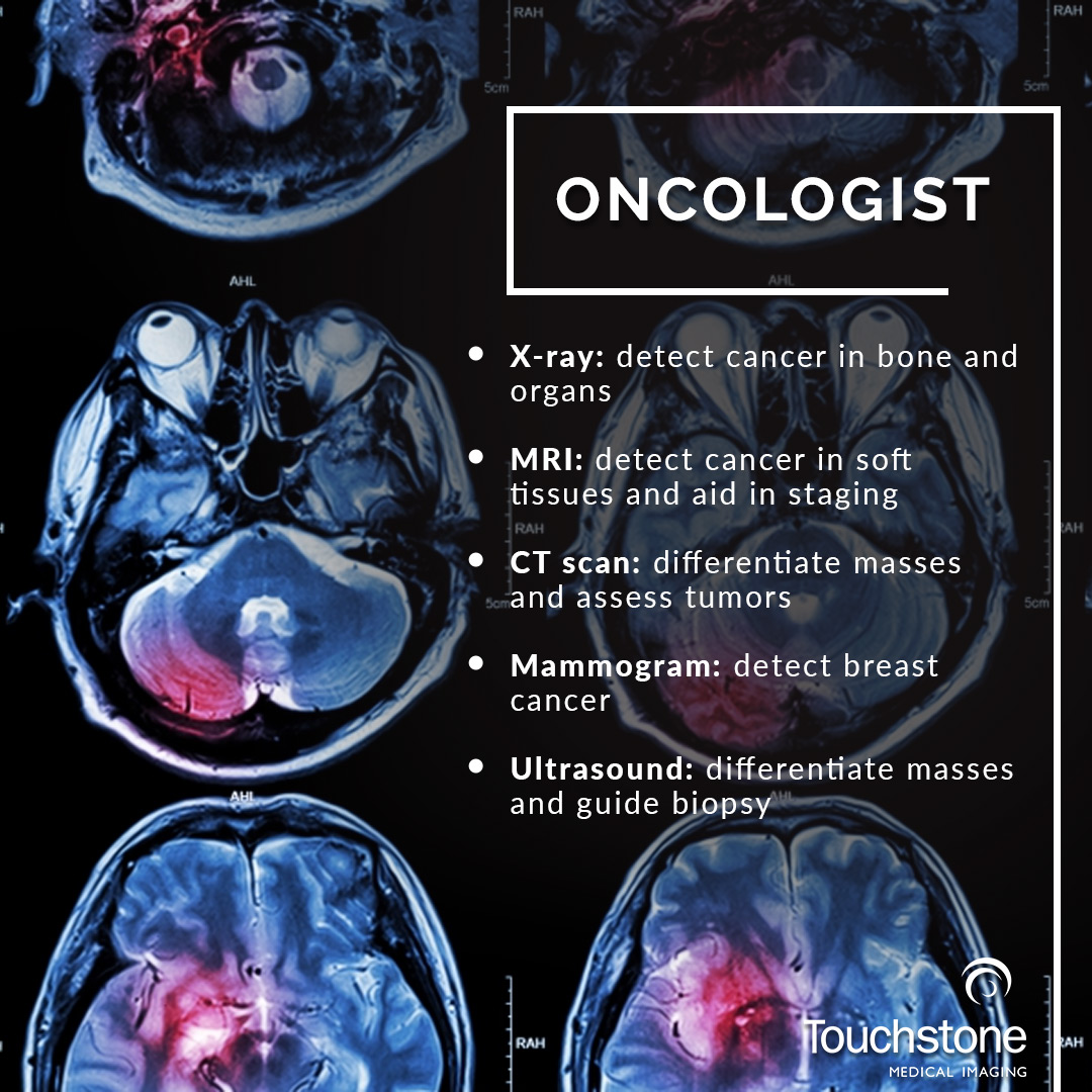 An oncologist is a doctor who specializes in the diagnosis and treatment of cancer. As you can imagine, imaging is a critical tool in this highly specialized field. Oncologists will use every form of diagnostic imaging technology to detect and stage cancer, then follow up on treatment success. X-rays can be used to detect cancer in bone and some organs like the lungs, stomach, and kidney. MRIs are useful in cancer detection in soft tissues in the body as well as staging cancer by finding places it may have metastasized (spread), and breast MRIs are special forms of MRI used to detect breast cancer. CT scans are particularly useful at showing a tumor’s shape and size, as well as differentiating tumors from other masses. Mammograms are special low-dose x-rays used to assess breast tissue and detect breast cancer. Ultrasounds can be useful in differentiating cysts from tumors and detecting tumors in tissues that x-rays cannot and can be used to guide biopsy. Bone scans and PET scans can also be used to better assess suspected cancers. Oncologists use diagnostic imaging to detect cancer cells and tumors and may order the use of different imaging modalities if one comes back abnormal to get a better look. Additionally, follow up scans may be ordered to assess the effectiveness of treatments and monitor for recurrence of cancer after remission.