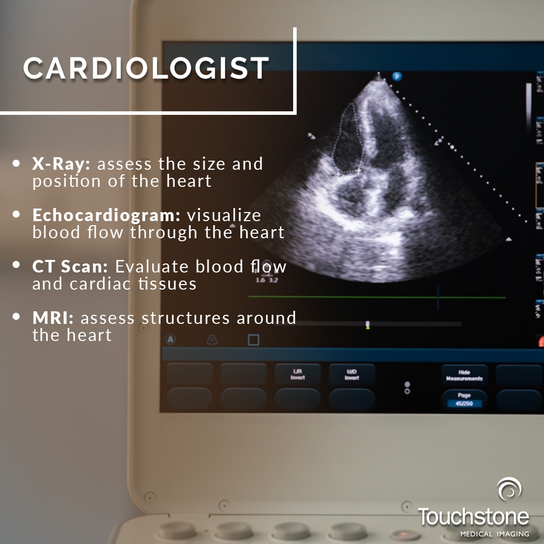Cardiologists are doctors who specialize in the functioning of the heart. They are focused on the diagnosis and effective treatment of cardiac problems. For the most part, cardiac imaging is performed by a cardiac radiologist. Diagnostic imaging procedures that can be used to assess the heart include an x-ray that helps assess the size and position of the heart in the chest cavity, as well as visualizing stents or tumors. Specialized cardiac ultrasounds, echocardiograms, are used to assess blood flow through the heart’s chambers. CT scans are particularly useful at viewing the heart’s structures, blood flow, and surrounding tissue. CT scans can evaluate tumors, blood vessels, and valves. MRIs are great to assess the structures around the heart and differentiate between tissues.